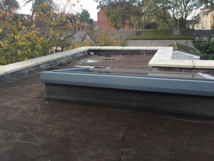 Roof Survey were contacted by the homeowner to analyse and assess the current roof condition – homeowner concerned over staining at junction of walls and roof. Roof Survey assessed the Membrane material and application to be substandard with defective detailing at junction between new roof and existing house.